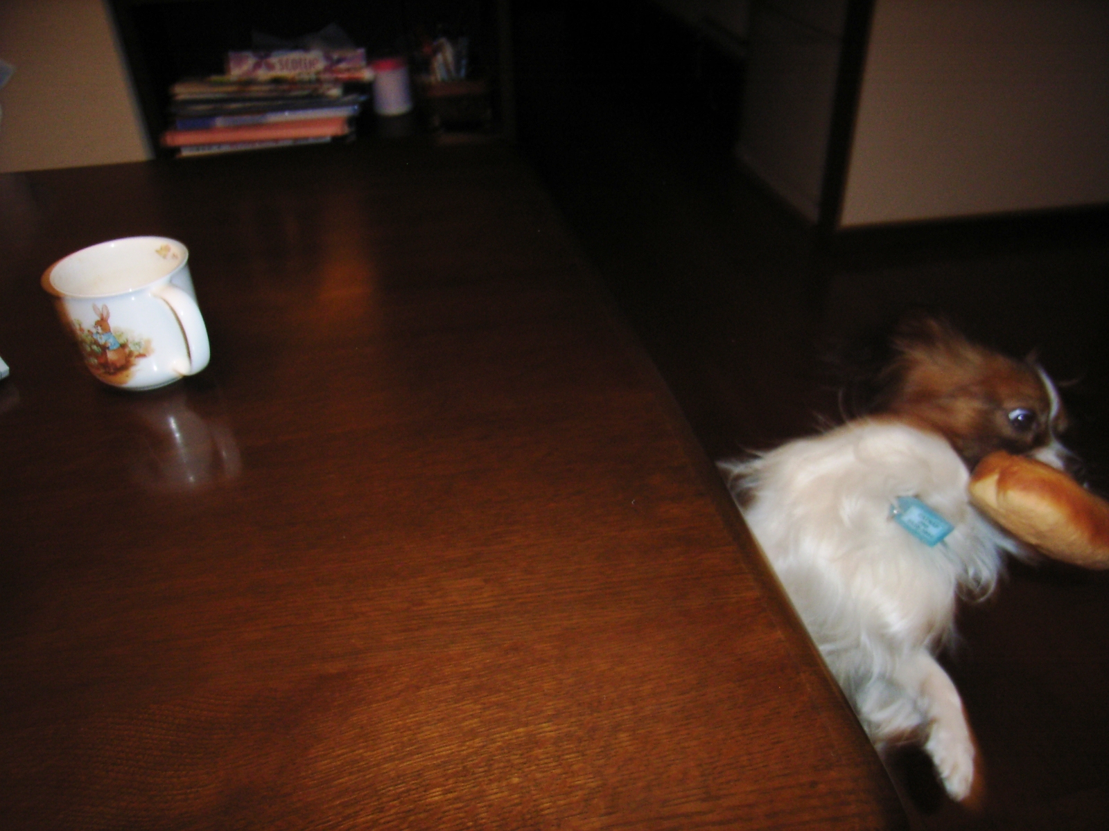 床に放り出してあったパン形のおもちゃを、何気なくテーブルに乗せておいたら・・・