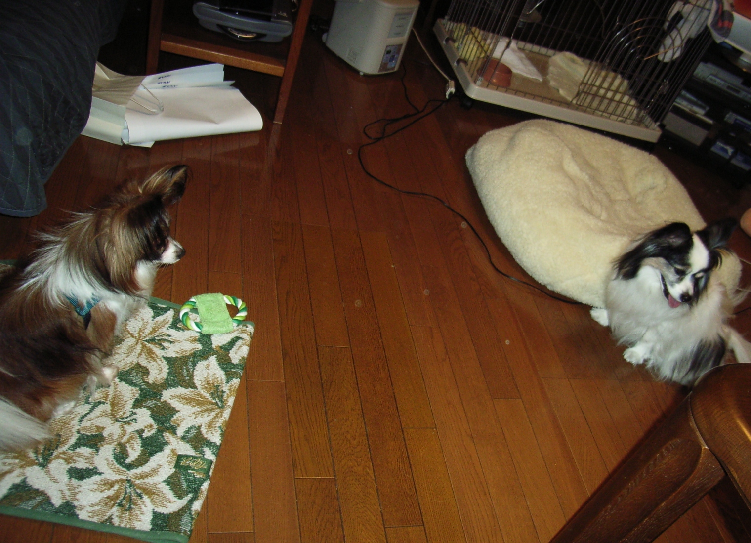 ロビン8.5K、シュシュ3.8Kg、どちらもれっきとしたパピヨン♂ しかーし、まるで別種犬みたい。 ロビンが規格外なだけ