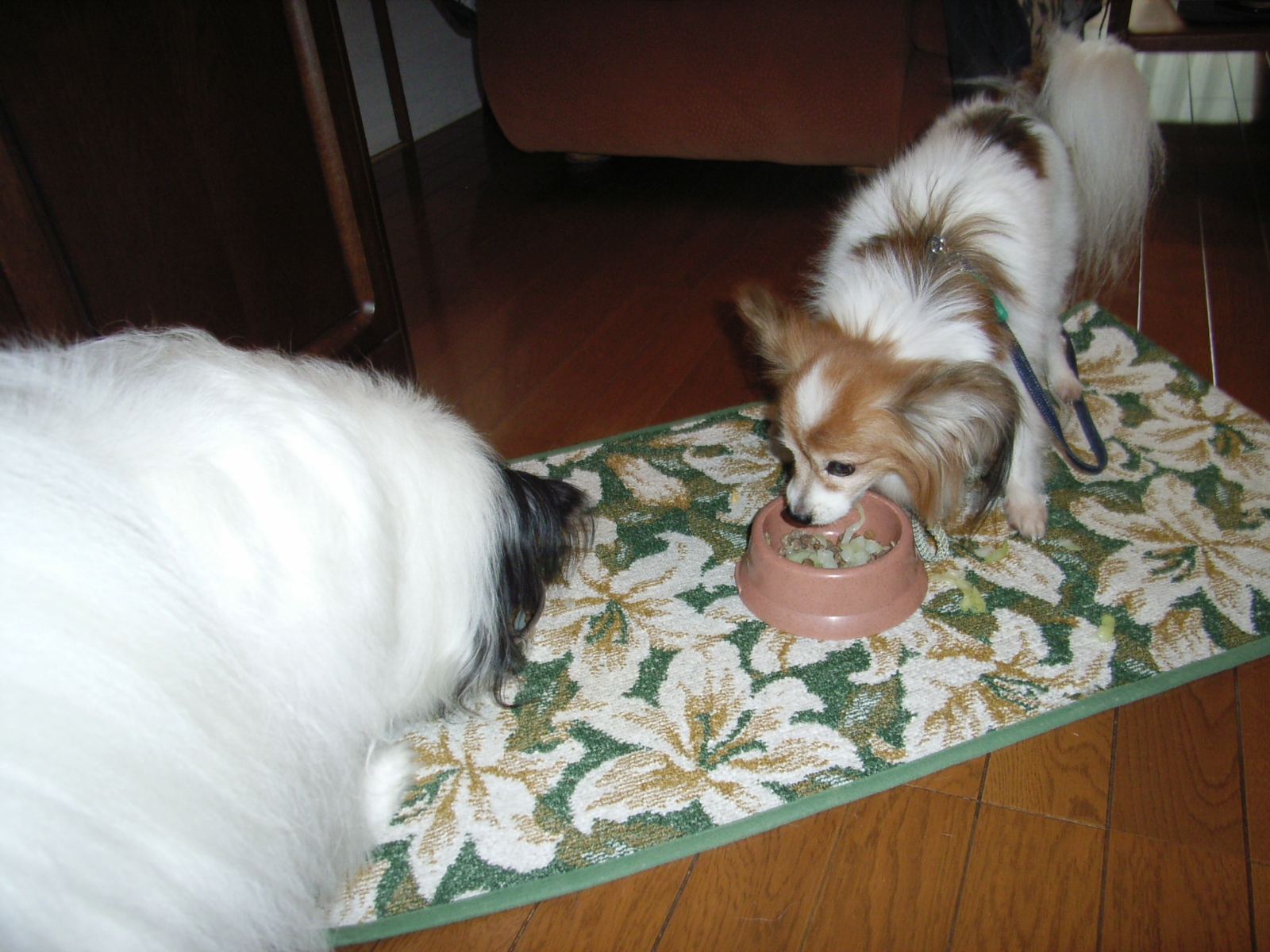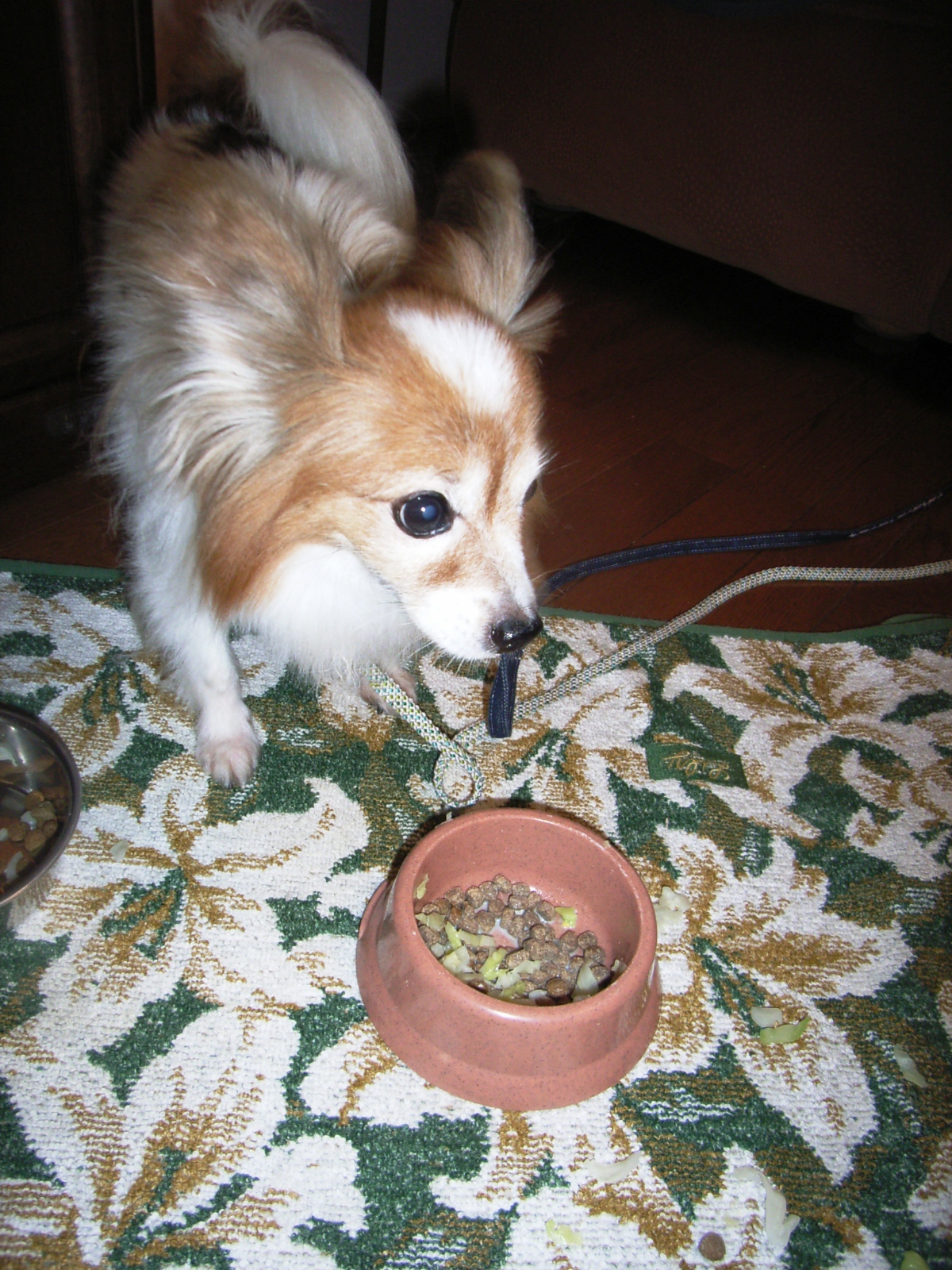 二日目の食事はこんな具合。 ドライフードに鶏肉と茹で野菜のトッピングが我が家の基本食。 ところがカリカリは大方ボウルの外へ。 野菜も一部跳ね飛ばし、肉だけ(当然)速攻ペロリ。 きびなごをトッピングしたら、1〜2匹味見してから好みではないと表明。