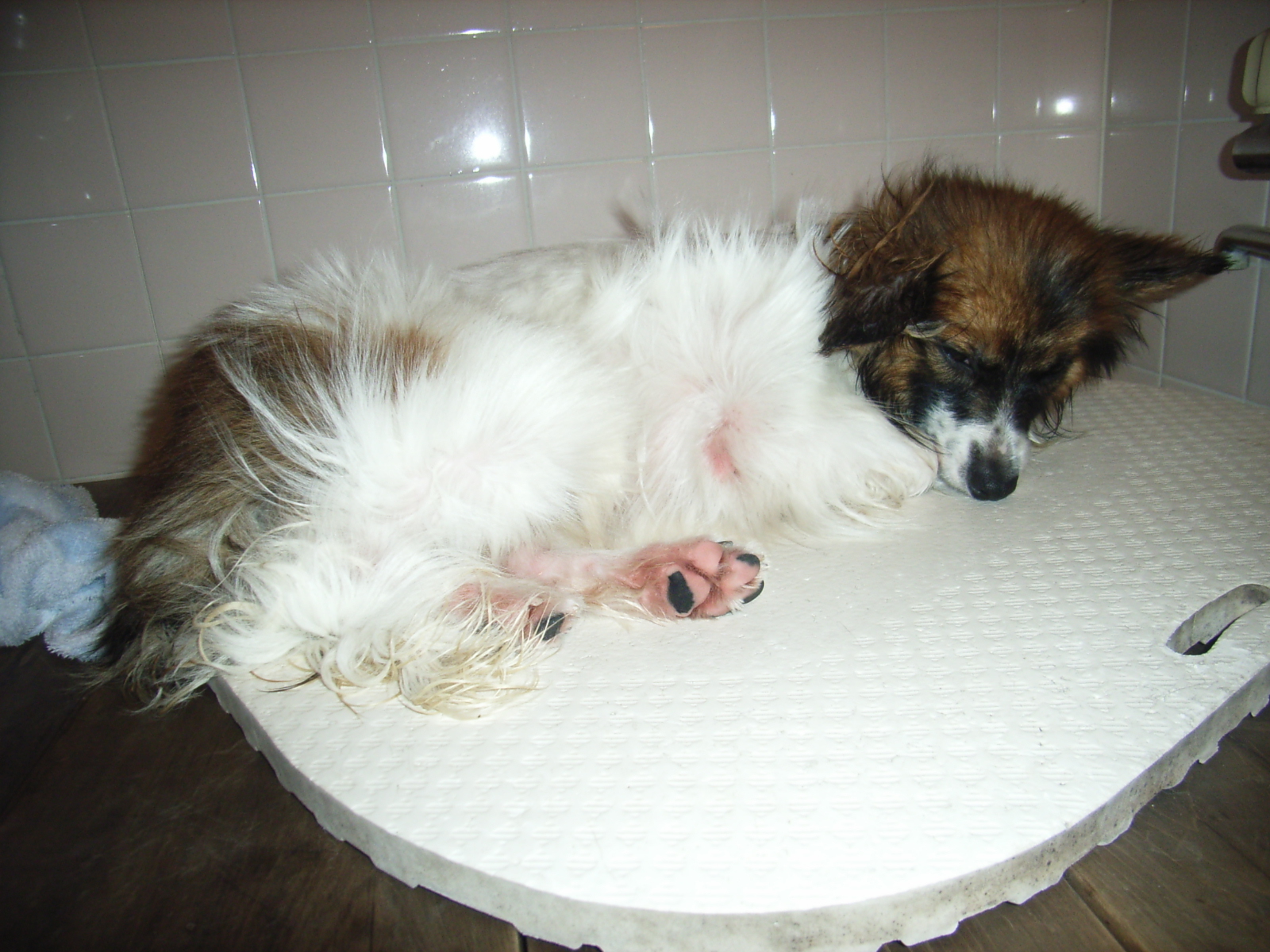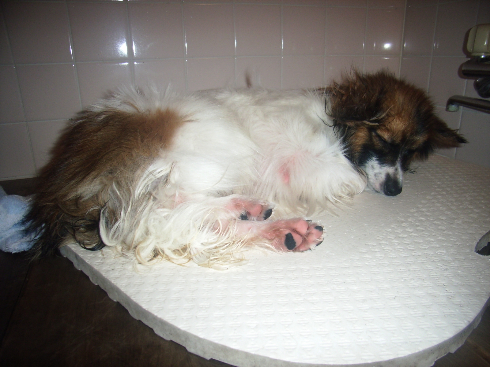 ところがね、ドライヤーが遣りにくいったら。 こんな具合に寝転んで非協力的。