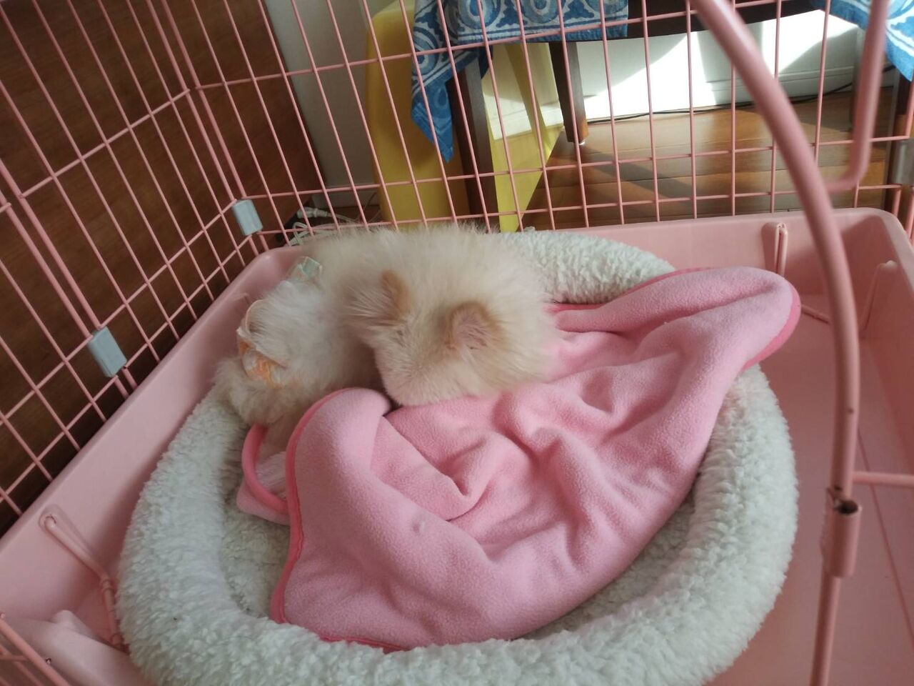ケージの隅っこに縮んでしまいました。