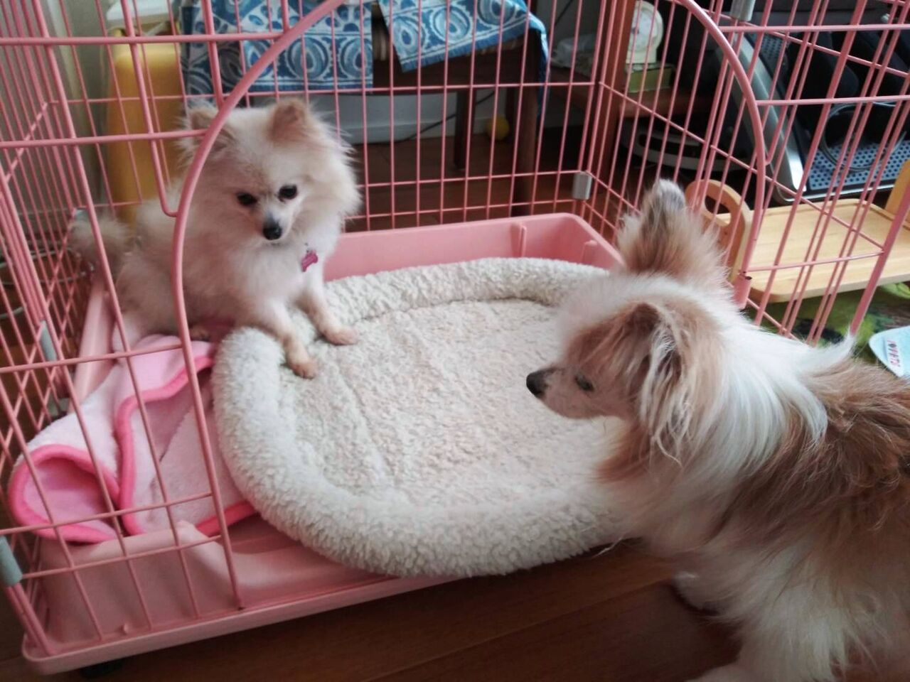 一日の大半をこのケージで過ごし、時々自分用のケージ訪問したり、