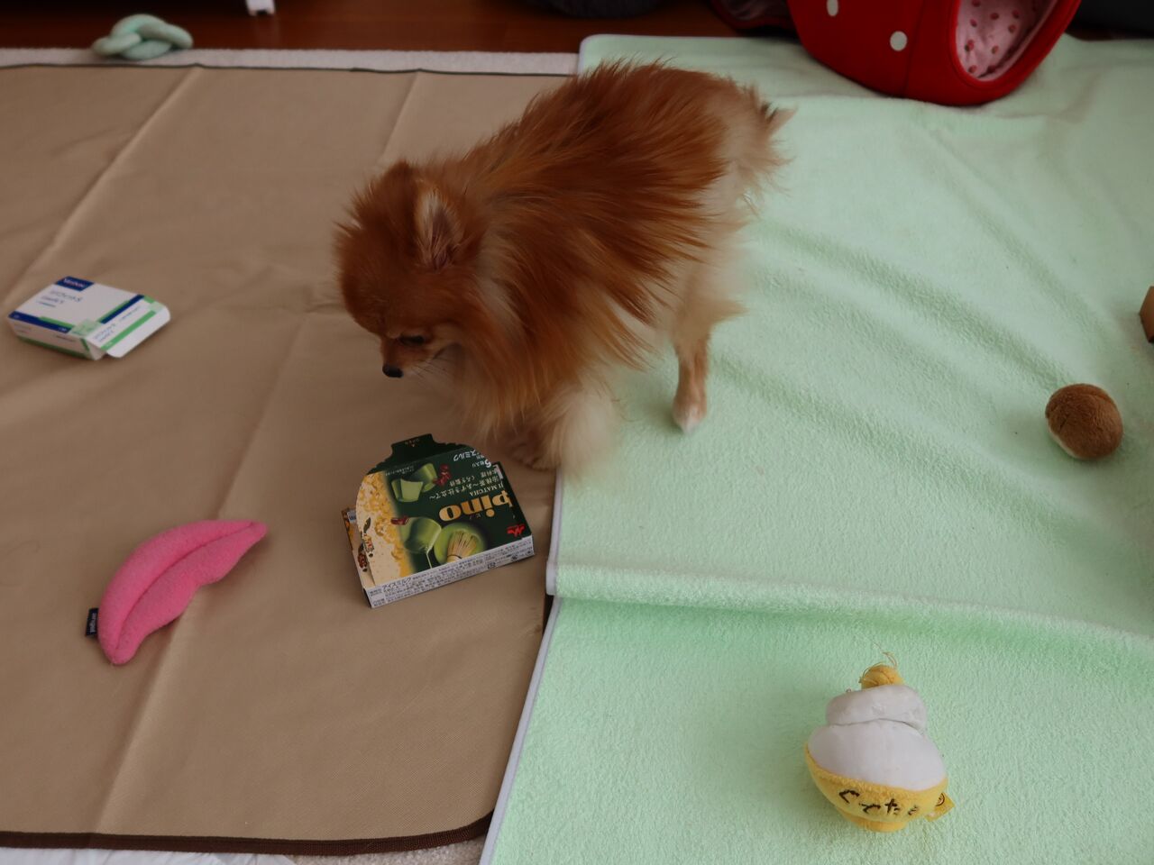 軽い箱にオヤツを仕込んでリビングに散乱。