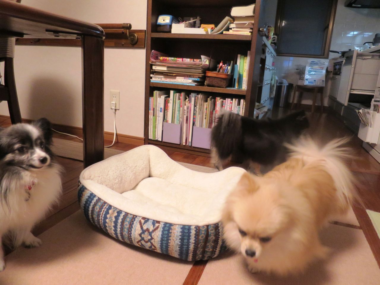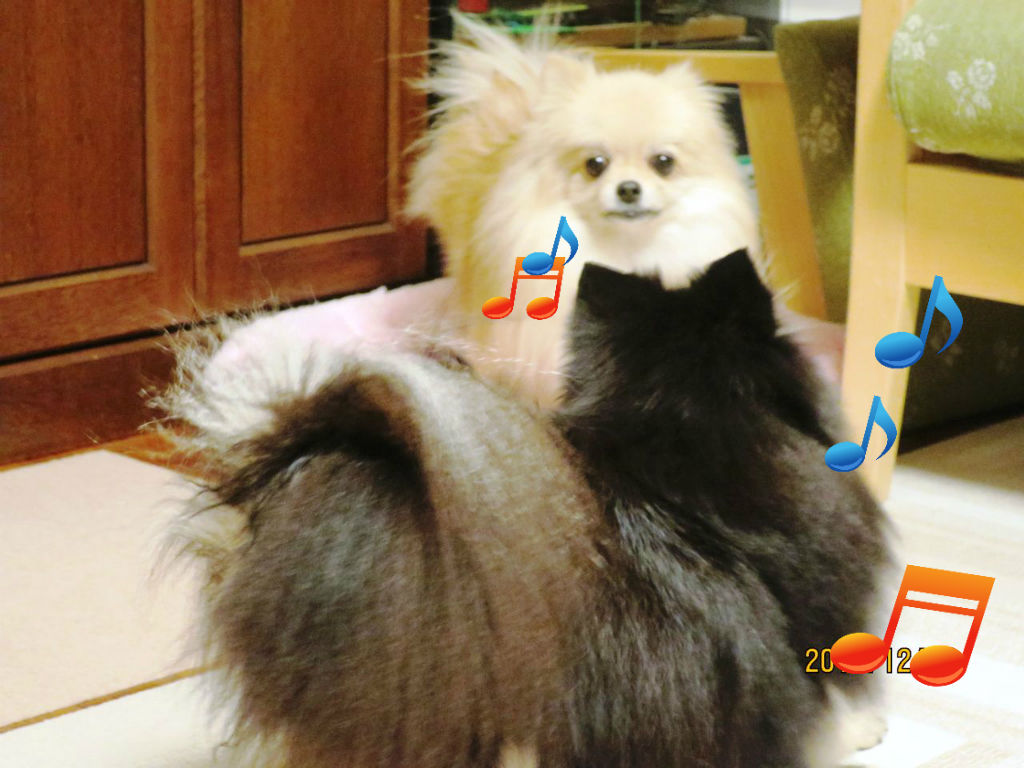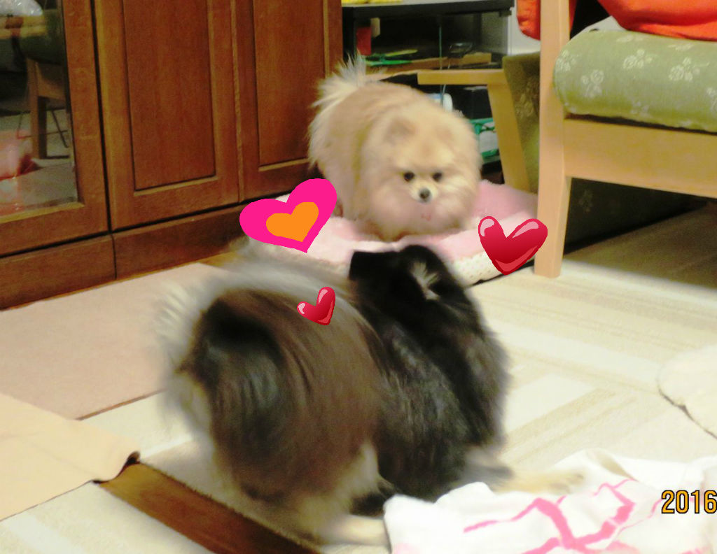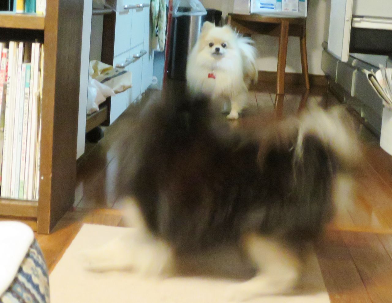 盛んに遊びを誘うポメママ。 仮母にも飛びついて甘えます