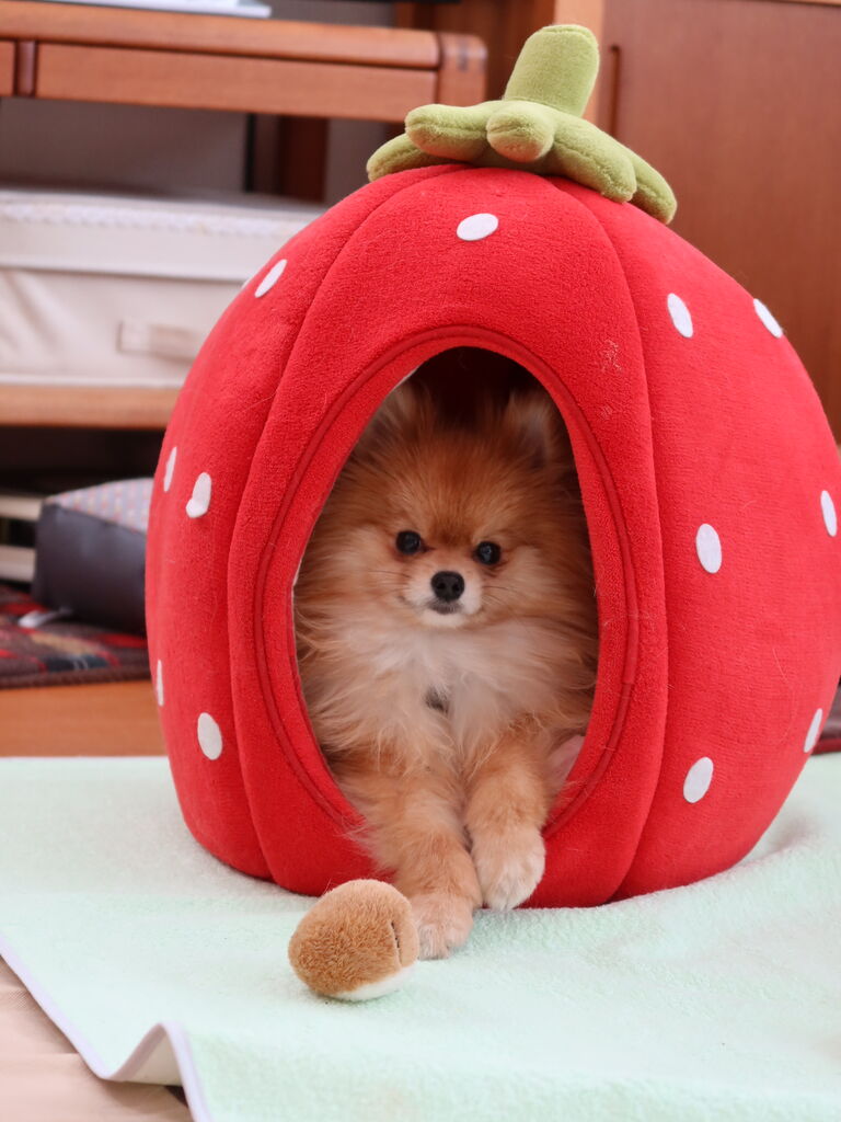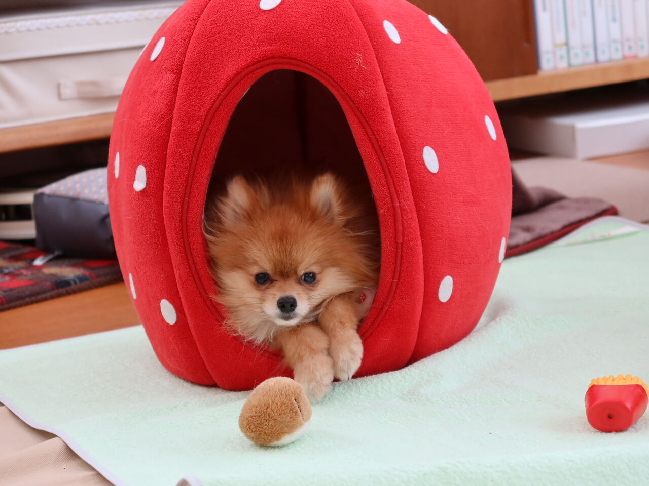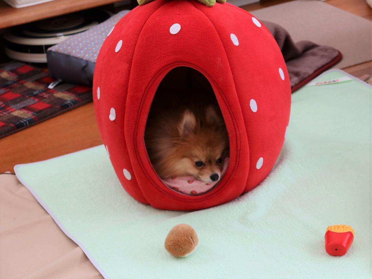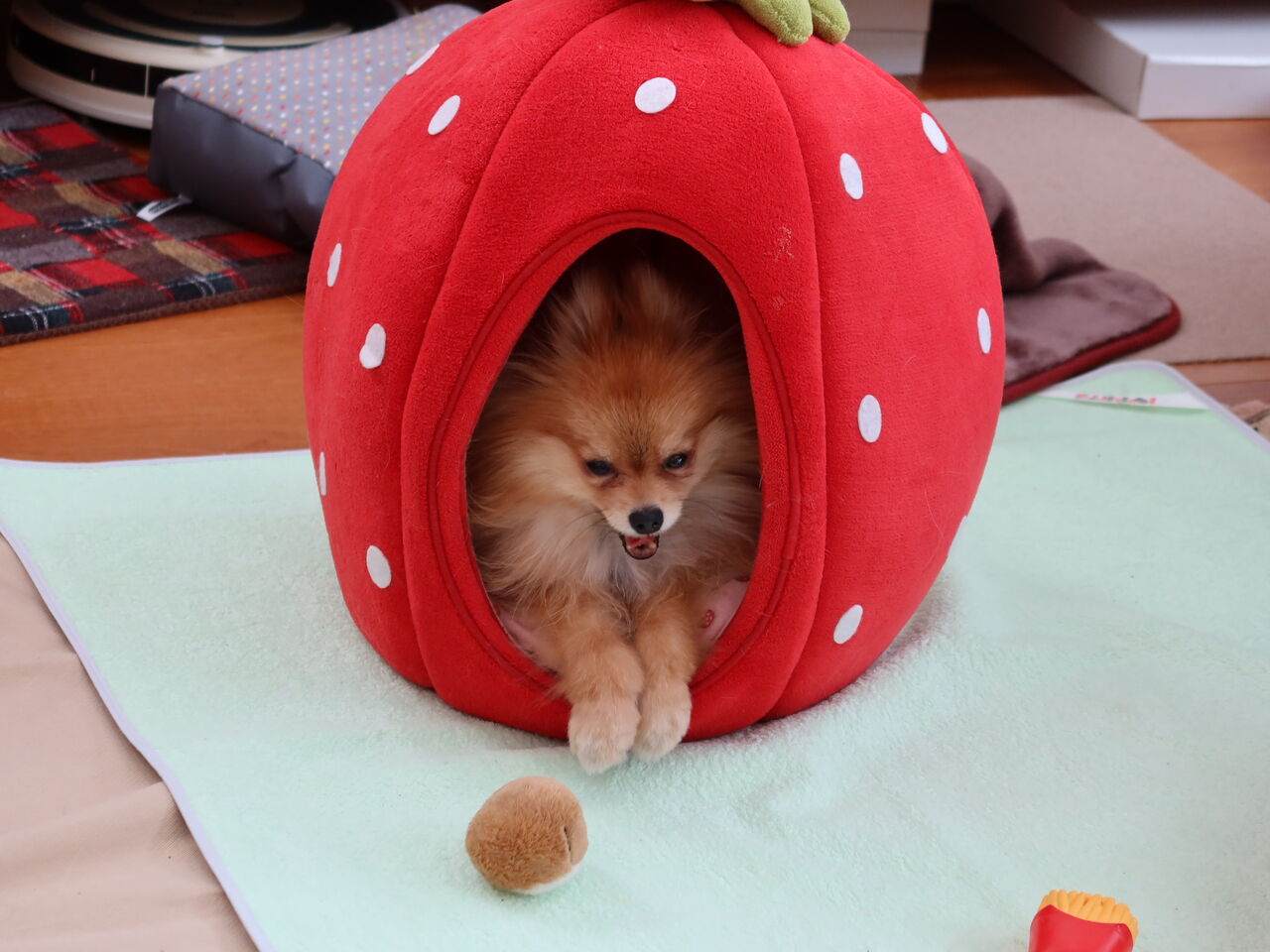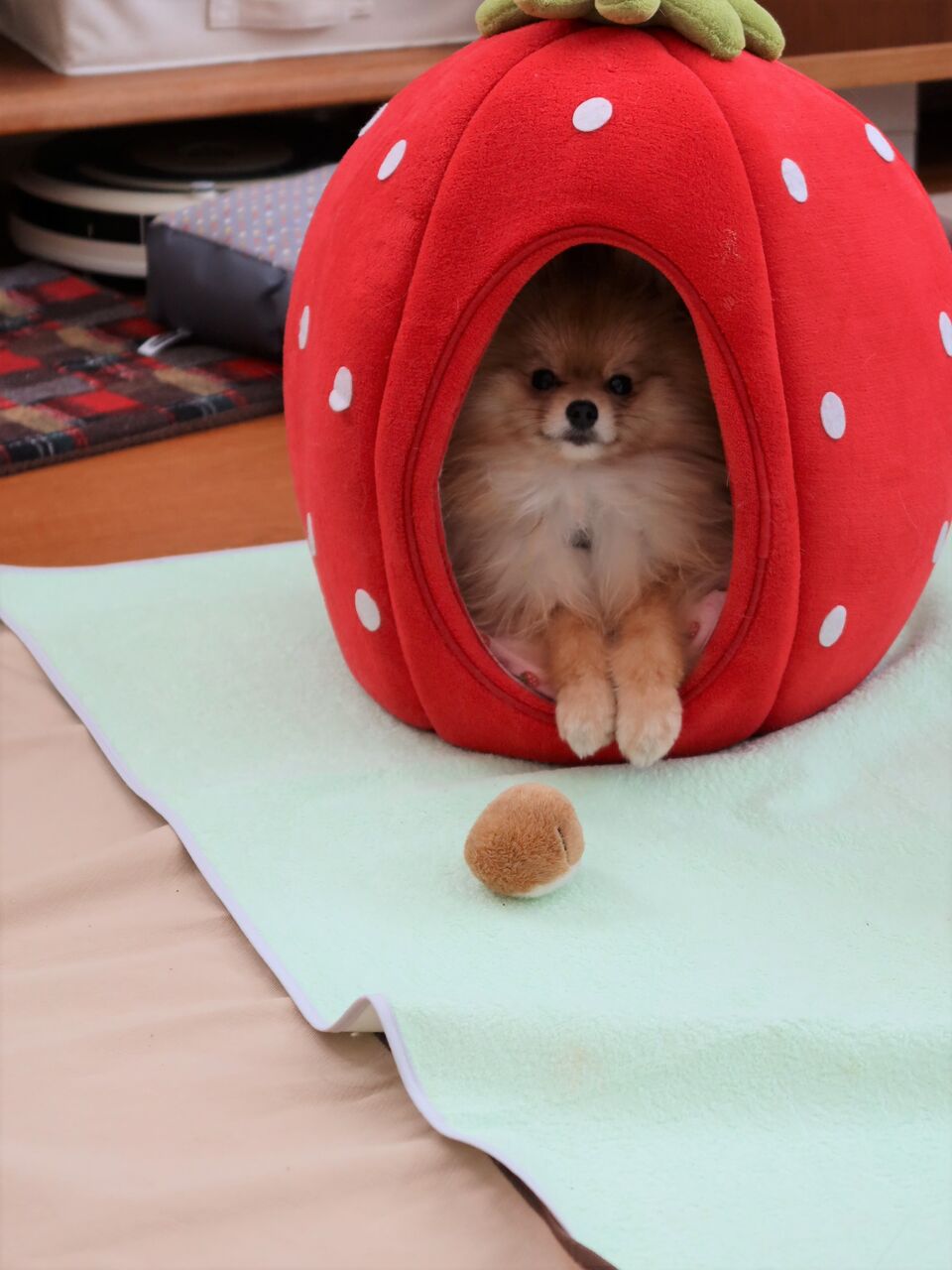 お気に入りだった苺ドームと、ガッチリ君を包むハーネスを婿入り道具に。